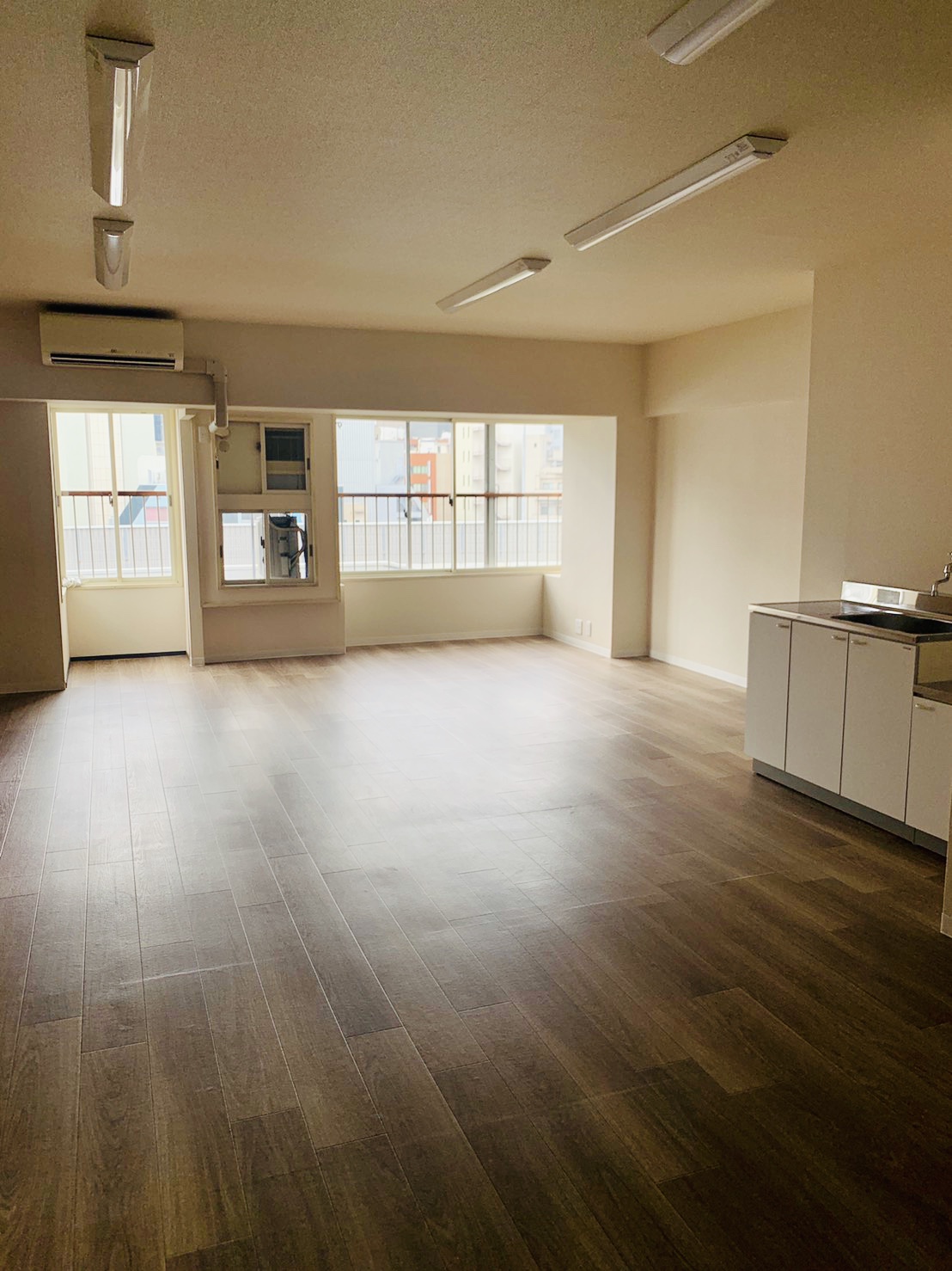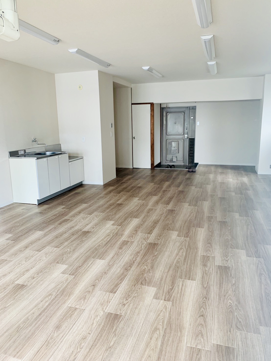 事務所、サロン、教室利用として居住用2DKから広々ワンルームにリノベーション 2020年6月クロス・フローリング・天井を全面張替、ミニキッチン・シャワートイレ・エアコン新設 |